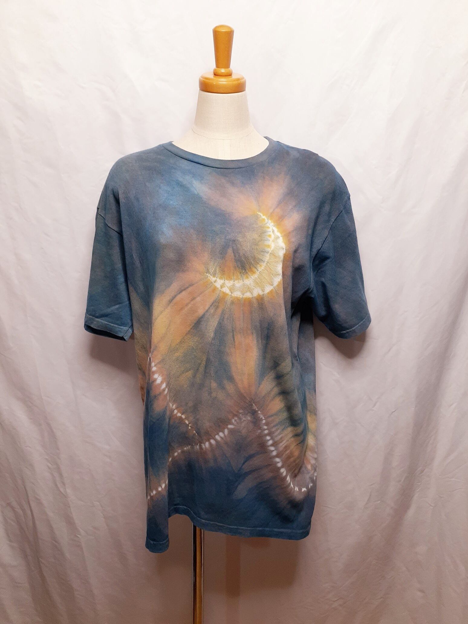 月と山の手染めTシャツ・兼用XLサイズ(藍染&ベンガラ染め)